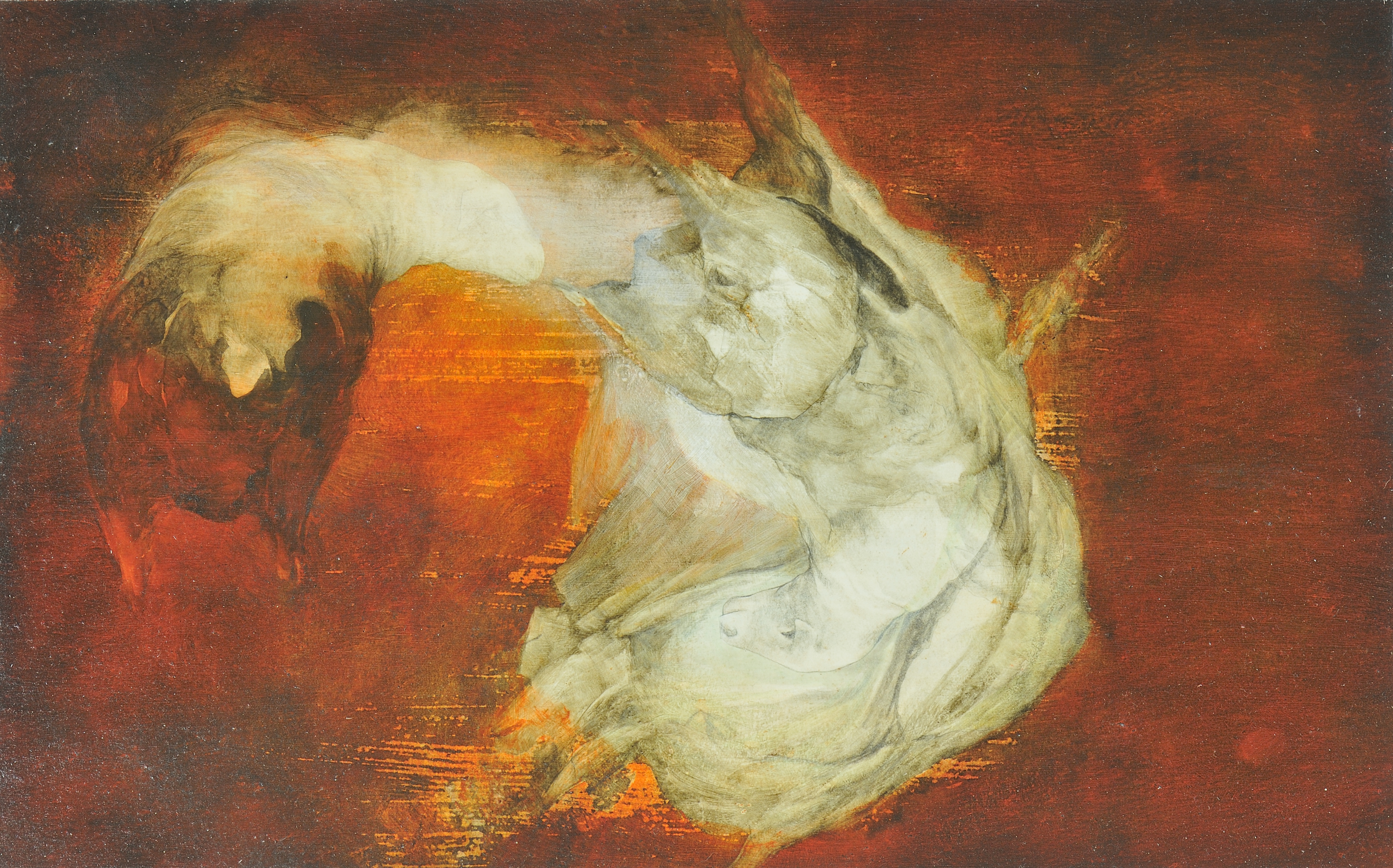 Le lendemain je passe un chiffon humide sur l’opacité et l’image revient des dessous, se confond avec le blanc d’Espagne, les deux dans une même épaisseur, perceptible dans cette si fine matérialité. J’attends un peu. Et puis l’eau rend malléable ce blanc. Je peux le pousser, le rendre de ma main plus fin, mouvement, couche épaisse, vaporeux. Je joue avec l’image de dessous, sans autre instrument que ma main. Quelques minutes. Je n’ai que quelques minutes avant de nouveau sentir la prise du mélange qui colle sous mes doigts. Quelques minutes intenses, instinctives, précieuses. Et puis tout redevient opaque.
