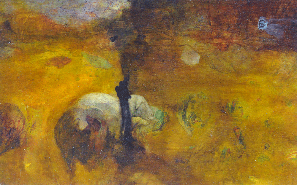 Patiemment, les pigments et l’huile viendront ensuite se superposer par toutes petites touches, très près, en glacis sur le vernis à retoucher.
